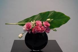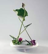 Wiring or modifying leaves by cutting or bending them to different shapes are all allowed. The vase is an important element of the arrangement and often includes free-form shapes. Sometimes two containers are used at the same time to create a single arrangement.