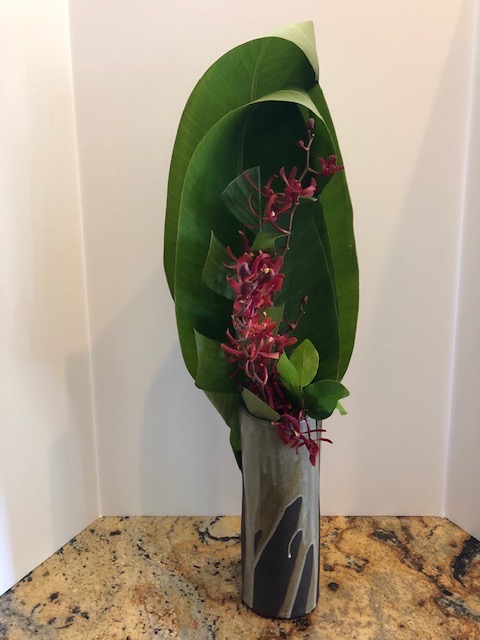 Carol Brecker using banana leaf, umbrella plant, & dendrobiums